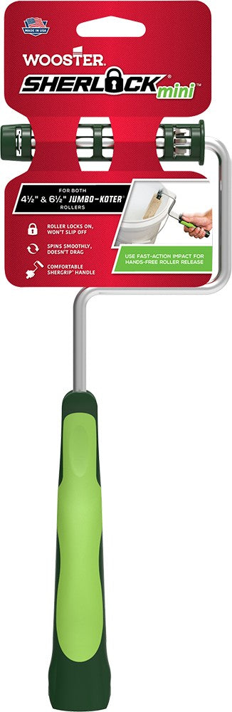 The Jumbo-Koter Shergrip handle has a smaller diameter, making it easier to hold. It weighs less than the Wooster professional grip, and therefore causes less fatigue. The two-part construction incorporates durable "Sherlock green" polypropylene and black elastomeric material for better grip. Sherlock GT pole compatible. The new Shergrip frame works with both 4.5" and 6.5" Jumbo-Koter minirollers.
